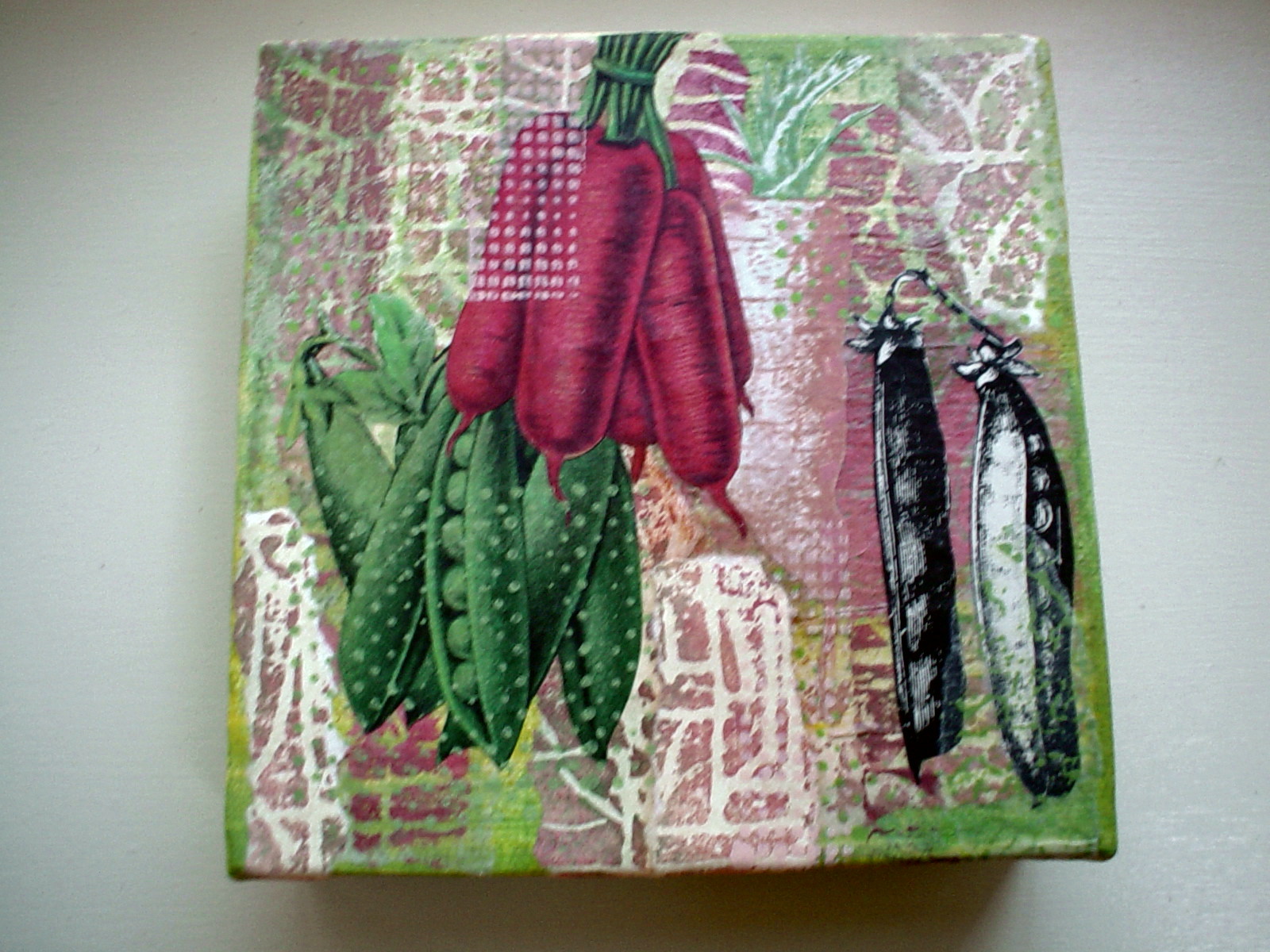Styrofoam stamping upon stamping on a polka dotted piece of cardstock. Added images from magazines. Butterfly is from a paper napkin. Stamp is from Norway and is sewn with vintage embroidery floss. The background intent is the dappling of leaves, thus, Leafy Green.
